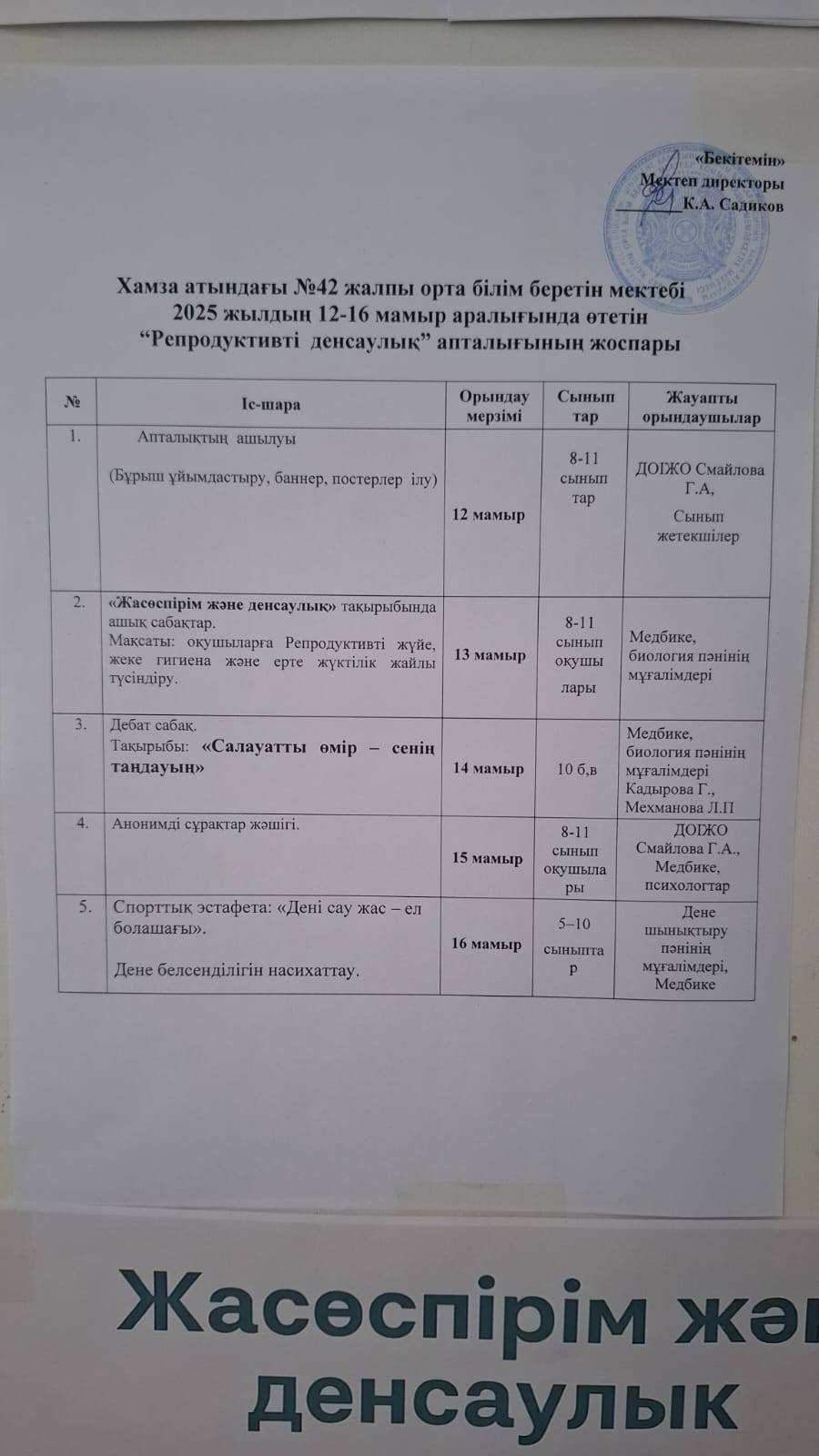Шымкент қаласы білім басқармасына қарасты Хамза атындағы №42 жалпы орта білім беретін мектебінде 12-16 мамыр аралығында РЕПРОДУКТИВТІ ДЕНСАУЛЫҚ АПТАЛЫҒЫ аясында, ашық сабақтар мен сыныптан тыс іс-шараларға арналған буклеттер, жадынамалар, презентацияларәзірленді.